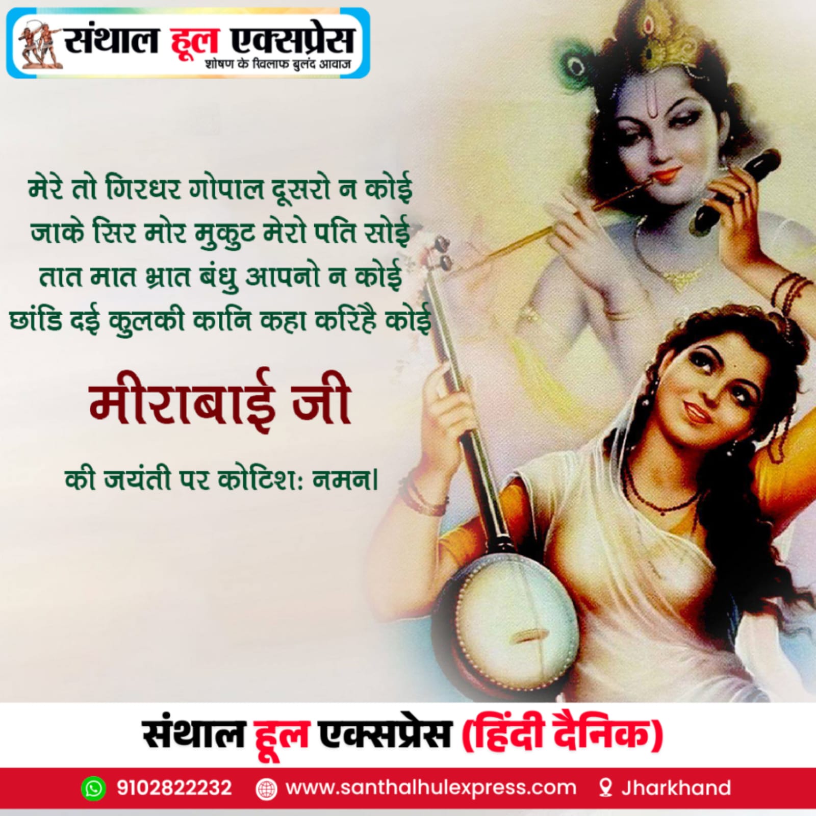 🌸 मीरा — भक्ति की वह धारा जो आज भी अमर है आज भारत संत परंपरा की महान विभूति संत मीरा बाई जी की जयंती श्रद्धा और भक्ति के साथ मनाई जा रही है।मीरा बाई का जीवन प्रेम, भक्ति, समर्पण और अदम्य साहस का ऐसा उदाहरण है, जो न केवल भारतीय इतिहास बल्कि विश्व की आध्यात्मिक चेतना में अमर हो चुका है। उनकी यह अमर पंक्ति — “मेरे तो गिरधर गोपाल, दूसरो न कोई”— केवल कविता नहीं, बल्कि भक्ति के परम सत्य की घोषणा है। 🕊️ जीवन परिचय: राजमहल से भक्ति मार्ग तक मीरा बाई का जन्म लगभग सन् 1498 में राजस्थान के कुड़की (पाली जिला) में हुआ था।वे मेड़ता के राठौड़ वंश से थीं और चित्तौड़गढ़ के राजा भोजराज की पत्नी बनीं।किन्तु सांसारिक वैभव और राजसी जीवन उनके हृदय को बाँध न