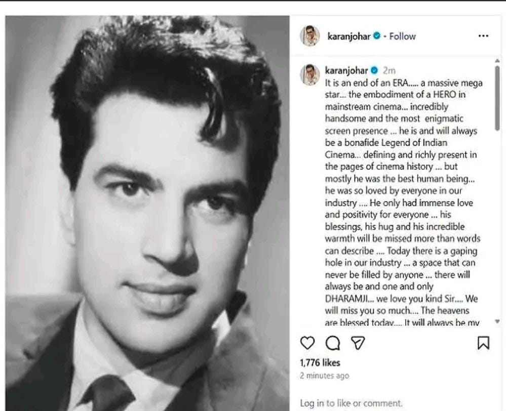 धर्मेंद्र के निधन पर फिल्म जगत शोक में डूबा, करण जौहर बोले—“एक युग का अंत”