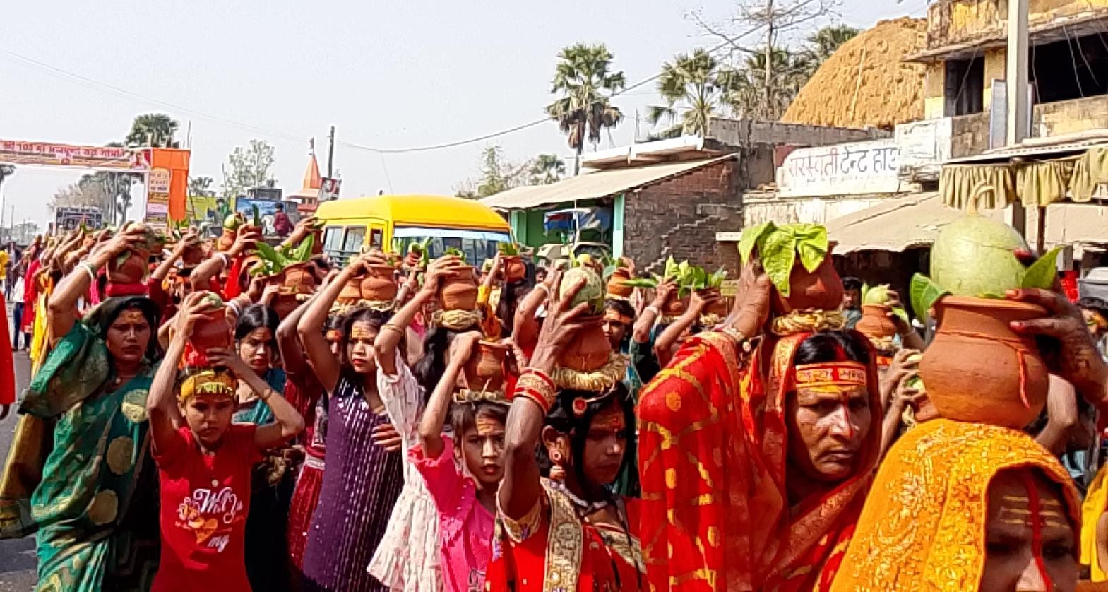 गोड्डा : जिले के मेहरमा प्रखंड क्षेत्र अंतर्गत एतेहासिक मेहरमा मेला से हर वर्ष की भांति इस वर्ष भी अन्नपूर्णा यज्ञ को लेकर भव्य कलश शोभायात्रा निकाली गई। यह कलश शोभायात्रा का शुभारंभ मेहरमा चौक के पास फीता काटकर सिन्हा इंटरनेशनल स्कूल मेहरमा के चेयरमैन सह समाजसेवी निरंजन सिन्हा, भाजपा जिलाध्यक्ष संजीव मिश्रा, भाजपा प्रखंड अध्यक्ष उमेश पासवान, यज्ञ पूजा समिति के अध्यक्ष मंतोष पासवान, कोषाध्यक्ष ब्रजकिशोर प्रसाद, संरक्षक अनिरूद्ध कुमार अनुज, राजेश लाल आदि के द्वारा किया गया। माथे पर कलश रखकर महिलाओं एवं कन्याएं के द्वारा पूरे स्थानीय बाराहाट बाजार एवं पत्तिचक-पिरोजपुर का परिभ्रमण करते हुए जय श्री राम, हर हर महादेव, जय मां अन्नपूर्णा, यज्ञ पुरुष भगवान की जय सहित कई देवी-देवताओं के जयकारे लगाए जा रहे थे। जगह-जगह पर स्थानीय लोगों द्वारा महिलाओं एवं कन्याएं सहित कलश शोभायात्रा में शामिल हुए श्रद्धालुओं के लिए पेयजल एवं शर्बत की समुचित व्यवस्था की गई। पूरा माहौल भक्तिमय में रम गया। महिलाओं एवं कन्याएं के द्वारा माथे पर कलश रखकर परिभ्रमण करने पश्चात यज्ञ स्थल पर बनारस के आचार्य चंद्र प्रकाश चौबे एवं उनके टोली के द्वारा वैदिक मंत्रोच्चारण के साथ कलश का स्थापना किया गया। इस मौके पर भाजपा पूर्व प्रदेश उपाध्यक्ष प्रिया सिंह पटेल, राजेश सिंह,रिंकू श्रीवास्तव सहित कई लोग मौजूद रहे।