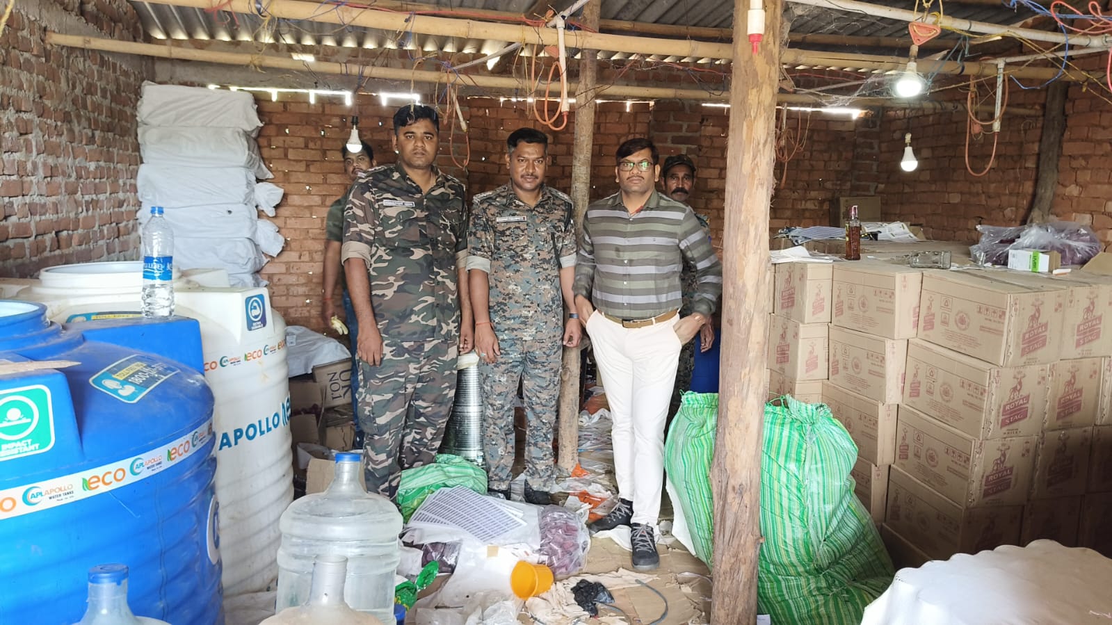 हजारीबाग : आज सहायक उत्पाद आयुक्त शिवकुमार साहू व उत्पाद निरीक्षक सुमितेश व भुनेश्वर नायक के संयुक्त नेतृत्व में हजारीबाग उत्पाद टीम के द्वारा दारू थाना क्षेत्र के अंतर्गत कंजिया गांव में एक पोल्ट्री फार्म के पीछे करकट से निर्मित एक बड़े मकान में गुप्त सूचना के आधार पर छापामारी की गई जिसमें भारी मात्रा में अवैध निर्मित विदेशी शराब, स्प्रीट लेवल एवं विभिन्न ब्रांडों के कर्क सहित खाली बोतलों को जप्त किया गया। इसमें आईबी रॉयल स्टैग इसकी लेवल वह 400 पेटी तैयार शराब जप्त की गई, वहीं दो बड़े टाइम से 235 शराब को भी जप्त कर लिया गया एवं 200 बड़ा खाली बोतल 50 गैलन स्प्रिट को भी उत्पाद विभाग की टीम के द्वारा जप्त कर लिया गया। पोल्ट्री फार्म चंद्रिका प्रसाद दारू खारिका निवासी का है एवं मुख्य अभियुक्त राहुल साव, अर्जुन प्रसाद, दिलीप कुमार का नाम शामिल है। अभी किसी अभियुक्त की गिरफ्तारी नहीं हो पाई है। गिरफ्तारी के लिए उत्पाद विभाग के द्वारा छापामारी जारी है। शराब की बाजार में अनुमानित कीमत 50 लाख रुपए की बताई जा रही है। इस छापामारी में उत्पाद विभाग के आयुक्त, उत्पाद निरीक्षक के साथ उत्पाद विभाग के बल शामिल रहे हजारीबाग उत्पाद टीम के द्वारा दारू थाना क्षेत्र अंतर्गत कंजिया नामक गांव में एक पोल्ट्री फार्म के पीछे करकट से निर्मित एक बड़े से मकान में गुप्त सूचना के आधार पर भारी मात्रा में अवैध निर्मित विदेशी शराब, स्प्रिट, विभिन्न कंपनियों के रैपर एवं लेबल विभिन्न ब्रांडों के, कर्क सहित भारी मात्रा में खाली बोतल जप्त किया जा रहा है। उत्पाद विभाग के सहायक आयुक्त शिव साहू भी हैरान है कि हजारीबाग में इतनी बड़ी मात्रा में विदेशी शराब, स्प्रिट, विभिन्न कंपनियों के रैपर एवं लेबल विभिन्न ब्रांडों के, कर्क सहित भारी मात्रा में खाली बोतल जप्त किया जा रहा है। उन्होंने बतलाया कि हम लोगों को गुप्त सूचना मिली थी कि दारू थाना क्षेत्र के अंतर्गत कंजिया अवैध शराब के साथ भारी मात्रा में स्प्रिट संचित किया जा रहा है। प्राप्त सूचना के आधार पर अंचल निरीक्षक कृष्ण प्रजापति और भुनेश्वर नायक के नेतृत्व में एक टीम गठित किया गया। और फिर तत्काल हम लोग छापेमारी किए। लेकिन जगह को चिन्हित करने में हम लोगों को काफी समस्या हुआ। आखिरकार में छापेमारी करने में जगह को चिन्हित करने में काफी समस्या का सामना करना पड़ा। और आखिरकार लास्ट में दरवाजा तोड़कर अंदर जब प्रवेश किया तो अवैध शराब उपलब्ध था। और यहां पर शराब बनाया जा रहा था। और शराब बनाने का सारा सामान उपलब्ध था। एक पोल्ट्री फार्म के पीछे करकट से निर्मित एक बड़े से मकान से गुप्त सूचना के आधार पर भारी मात्रा में अवैध निर्मित विदेशी शराब, स्प्रिट, विभिन्न कंपनियों के रैप