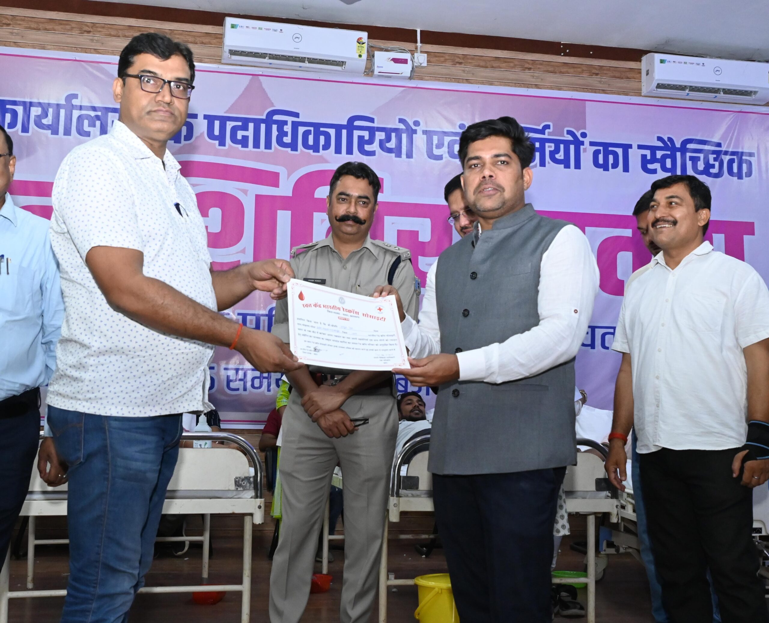 चतरा: चतरा जिला प्रशासन की ओर से स्वैच्छिक रक्तदान शिविर का आयोजन मंगलवार को जिला खनिज फाउंडेशन ट्रस्ट सह प्रशिक्षण भवन हॉल में किया गया। इस शिविर में उपायुक्त रमेश घोलप, पुलिस अधीक्षक विकास पाण्डेय, डीएफओ (दक्षिणी) मुकेश कुमार, डीडीसी अमरेन्द्र सिन्हा, सिविल सर्जन डॉ. दिनेश कुमार, जिला परिवहन पदाधिकारी इन्दर कुमार, जिला शिक्षा अधीक्षक राम जी कुमार, जिला भू-अर्जन पदाधिकारी वैभव सिंह सहित कई पुलिस पदाधिकारी, प्रखंड विकास पदाधिकारी एवं अंचल अधिकारी शामिल हुए। सभी ने बढ़-चढ़कर भाग लेते हुए रक्तदान किया। शिविर में रक्तदान करने के बाद उपायुक्त रमेश घोलप ने कहा, “रक्तदान न केवल एक महान मानवीय सेवा है, बल्कि यह जरूरतमंद मरीजों के जीवन को बचाने में अहम भूमिका निभाता है।” उन्होंने कहा कि हर स्वस्थ व्यक्ति को स्वेच्छा से रक्तदान करना चाहिए क्योंकि यह पूरी तरह से सुरक्षित प्रक्रिया है। उपायुक्त ने आम लोगों से अपील की कि वे नियमित रूप से रक्तदान शिविरों में भाग लें और इसे एक सामाजिक जिम्मेदारी के रूप में अपनाएं। पुलिस अधीक्षक विकास पाण्डेय ने कहा कि “चतरा पुलिस आमजन की सेवा के लिए सदैव तत्पर है। यह स्वैच्छिक रक्तदान अभियान भविष्य में भी जारी रहेगा, जिससे जरूरतमंदों को समय पर रक्त उपलब्ध कराया जा सके। रक्तदान शिविर में 189 यूनिट से अधिक रक्त संग्रहित किया गया, जो जिले की स्वास्थ्य आवश्यकताओं को पूरा करने में सहायक सिद्ध होगा।