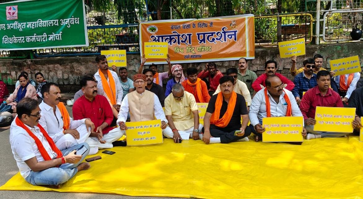 रांची:विश्व हिन्दू परिषद, बजरंग दल रांची महानगर, रांची ग्रामीण जिला एवं विभिन्न धार्मिक, सामाजिक तथा सभी समविचारी हिन्दू संगठनों के तत्वावधान में राजभवन के समक्ष धरना दिया गया। पश्चिम बंगाल में हिंदू लक्षित हिंसा पर आक्रोश व्यक्त करते हुए हिंदुओं की सुरक्षा पर चिंता व्यक्त की गई। उपस्थित वक्ताओं ने कहा बंगाल में कानून व्यवस्था नाम की कोई चीज नहीं है । सैकड़ो हिंदू परिवार मुर्शिदाबाद एवं अन्य जिलों से पलायन कर रहे हैं उनमें एक भय का माहौल व्याप्त है। वर्तमान ममता सरकार हिंदुओं को सुरक्षा प्रदान करने में असमर्थ है । कानून व्यवस्था पूरी तरह ध्वस्त हो चुकी है। अतः विश्व हिंदू परिषद ममता सरकार को बर्खास्त कर पश्चिम बंगाल में राष्ट्रपति शासन लगाने की मांग करती है।