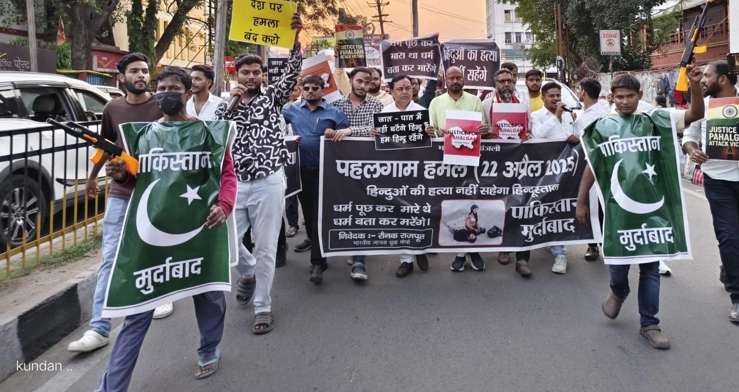 रांची,:भारतीय जनता युवा मोर्चा अपर बाज़ार मंडल अध्यक्ष रौनक सिंह राजपूत के नेतृत्व में गाड़ीखाना चौक से अल्बर्ट एक्का चौक तक पाकिस्तान मुर्दाबाद, आतंकवादियों को पाकिस्तान में घुसकर मारेंगे के नारे लगाते हुए पैदल मार्च किया किया गया मौके पर रोमित नारायण सिंह ने कहा पहलगांव में घटी आतंकवादी घटना पाकिस्तान की बौखलाहट को दिखाती है, इस तरीके की घटना को किसी भी कीमत पर बर्दाश्त नहीं किया जाएगा हमारी देश की बहादुर सेना पाकिस्तान के अंदर घुसकर इसके आतंकवादियों को चुन चुन कर मारेगी और पाकिस्तान को निस्तेनाबूद कर देगी। इस कार्यक्रम में मुख्यरूप से बालमुकुंद सहाय, रमेश सिंह, बलराम सिंह, पीयूष विजयवर्गीय, रोहित सिंह रोनी,आयुष सिंह, धर्मवीर सिंह, सचिन साहू, रूपक मिश्रा, राहुल गुप्ता, रोहित राज पांडे सहित सैकड़ों की संख्या में युवा शामिल