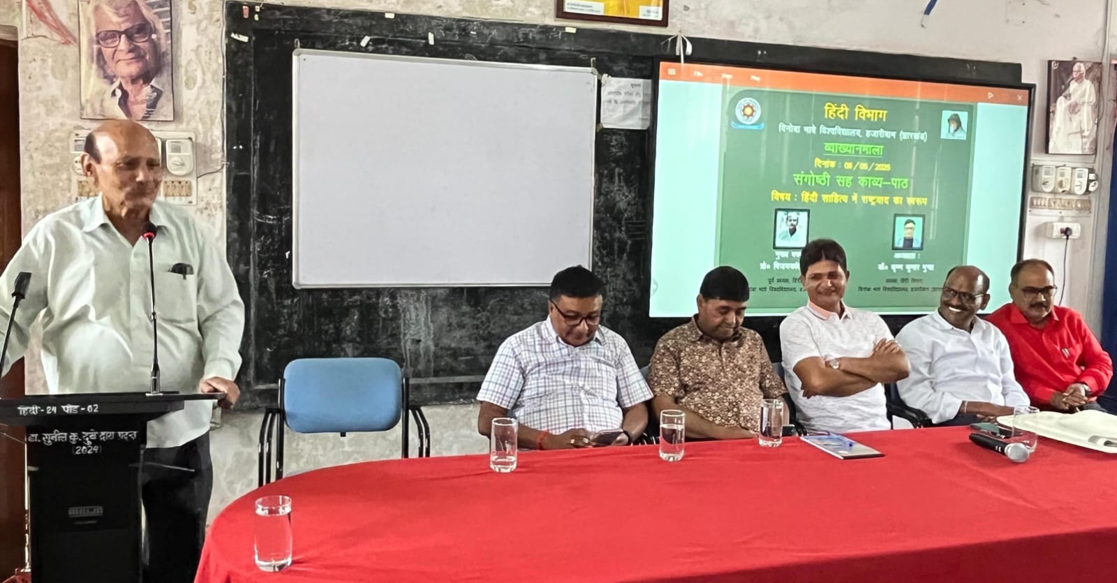 हजारीबाग : विनोबा भावे विश्वविद्यालय के हिन्दी विभाग में मंगलवार 6 मइ, 2025 को कुलाधिपति व्याख्यान माला के अंतर्गत प्रथम व्याख्यान का आयोजन विभागाध्यक्ष डॉ० कृष्ण कुमार गुप्ता की अध्यक्षता में की गई। संगोष्ठी का विषय हिन्दी साहित्य में राष्ट्रवाद का स्वरूप’रखा गया, तथा मुख्य वक्ता के रूप में प्रो० विजयकांत धर दुबे की उपस्थिति रही। विभागाध्यक्ष डॉ० कृष्ण कुमार गुप्ता ने विश्व स्तर पर राष्ट्रीयता की बात की, साथ ही विद्यार्थियों के भीतर राष्ट्र भावना जगाने का कार्य किया। मुख्य वक्ता के रूप में आए प्रो० विजयकांत धर दुबे ने राष्ट्रवाद का प्रयोग सर्वव्यापकता के साथ करने पर जोर दिया, राजभाषा हिन्दी के माध्यम से समाज में जागरूकता फैलाने की बात कही। विभागीय प्राध्यापक डॉ० केदार सिंह ने राष्ट्र प्रेम को बढ़ाते हुए एकता की बात पर जोर दिया। डॉ० सुबोध सिंह शिवगीत ने राष्ट्रीय गुणों की चर्चा, हिन्दी साहित्य को समावेशित करते हुए की, साथ हीं राष्ट्र की चिंता व्यक्त करते हुए समाधान की ओर भी ध्यान अग्रसारित करवाया। अतिथि स्वरूप आए शिक्षक आनंद सिंह ने मित्रवत्त व्यवहार रखने की बात कही और कवि माखनलाल चतुर्वेदी के उदाहरण से राष्ट्र भावना, विद्यार्थियों के हृदय में उद्भूत किया। मंच संचालन विभागीय प्राध्यापक डॉ० राजू राम और धन्यवाद ज्ञापन डॉ० सुनील कुमार दुबे के द्वारा सम्पन्न हुई। स्वागत गीत विद्यार्थी मानसी कुमारी और पूर्वी ऊषा के द्वारा प्रस्तुत किया गया। उक्त व्याख्यान में प्राध्यापकों के साथ साथ शोधार्थी और समसत्र द्वितीय और चतुर्थ के सैकड़ों की संख्या में विद्यार्थी उपस्थित रहे।