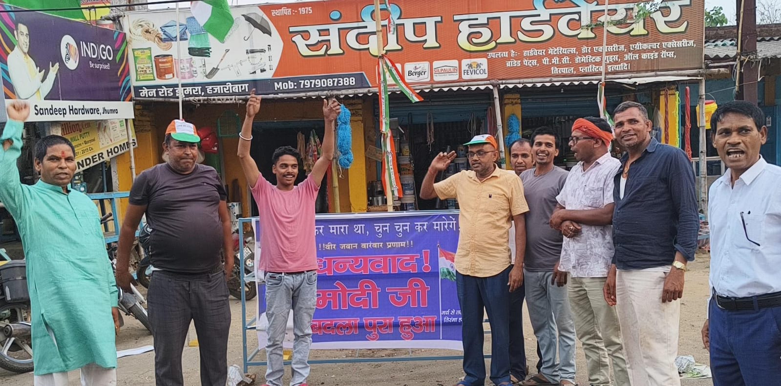 हजारीबाग : पहलगाम आतंकी हमले के बदले में ऑपरेशन सिंदूर के खुशी में झुमरा चौक में झुमरवासियों ने बम पटाखा फोड़कर खुशी जाहिर किया और प्रधानमंत्री नरेंद्र मोदी को धन्यवाद दिया। भारतीय जनता पार्टी के मंडल अध्यक्ष अशोक कुशवाहा ने बतलाया कि पहलगाम में हुए बर्बर आतंकी हमले के बाद भारत ने शब्दों से नहीं बल्कि आतंकवाद को सीधा जवाब गोलों से दिया है। भारत ने उसी जगह चोट की है, जहां से साजिश रची गई थी। बीती रात भारत ने पाकिस्तान और पाकिस्तान के कब्जे वाले कश्मीर (पीओके) में आतंकवादी ढांचे पर एक सटीक और योजनाबद्ध जवाबी कार्रवाई की। इस कार्रवाई को ऑपरेशन सिंदूर नाम दिया गया है। रक्षा मंत्रालय ने पुष्टि की कि यह ऑपरेशन पहलगाम में हुए बर्बर आतंकी हमले के जवाब में किया गया, जिसमें 25 भारतीय और एक नेपाली नागरिक की जान गई थी। इसके कुछ मिनट बाद ही एक और पोस्ट आया जिसमें लिखा था, न्याय पूरा हुआ, जय हिंद। संजय कुमार कुशवाहा ने बतलाया कि इसके साथ ही यह कार्रवाई पूरी तरह मापी-तौली गई है और इसका मकसद सिर्फ आतंकी ढांचे को तबाह करना था, न कि किसी पाकिस्तानी सैन्य ठिकाने को निशाना बनाना। 9 जगहों पर किया गया स्ट्राइक प्रेस सूचना ब्यूरो (पीआईबी) के मुताबिक, कुल 9 जगहों पर सटीक हमले किए गए। इनमें मुजफ्फराबाद, बहावलपुर और कुछ अन्य स्थानों का जिक्र है, जहां धमाकों की आवाजें सुनी गईं। यह भी बताया गया कि इन हमलों के लिए खास सावधानी बरती गई ताकि किसी नागरिक या सैन्य ठिकाने को नुकसान न पहुंचे। सुनील कुमार यादव ने बतलाया कि भारत ने गजब की संयम और परिपक्वता के साथ लक्ष्य चुना और ऑपरेशन को अंजाम दिया। यह कदम यह साबित करता है कि भारत अब आतंक के खिलाफ किसी भी हद तक जाने को तैयार है और जो भी दोषी हैं, उन्हें बख्शा नहीं जाएगा। सभी स्थानीय ग्रामीण ने जय हिंद जय भारत वंदे भारत, भारत माता की जय का नारा लगाया पूरा चौक भारत माता के नर से गूंज उठा।