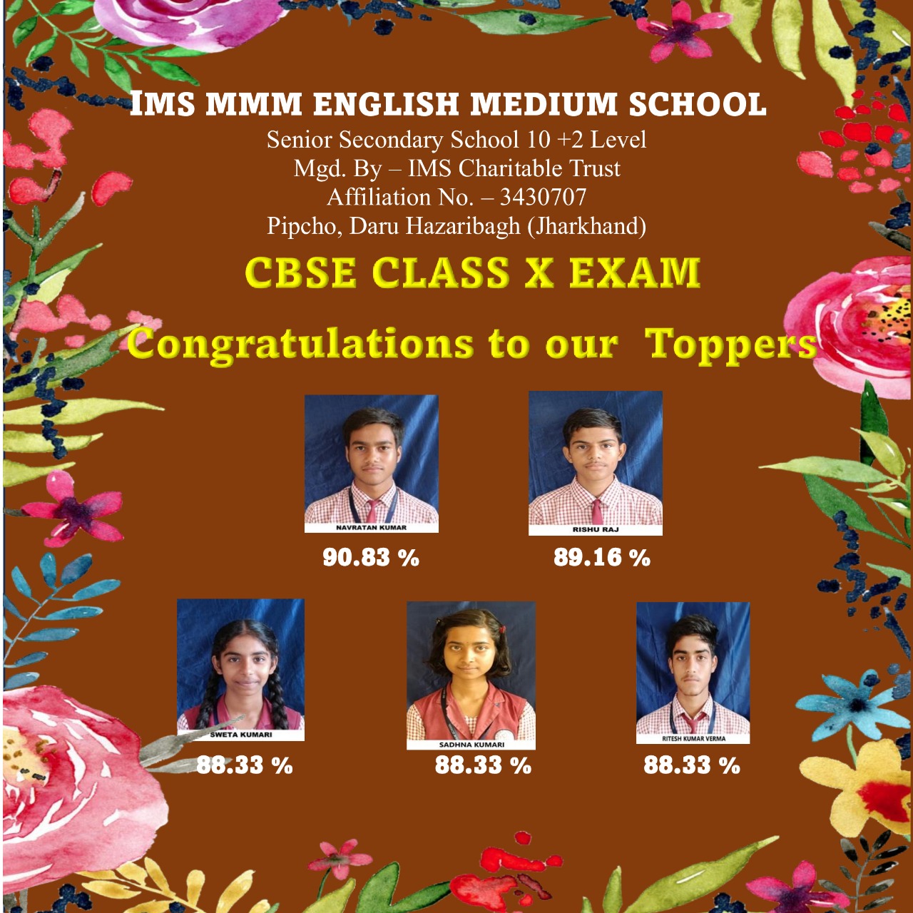 हजारीबाग : जिले के दारू प्रखंड में स्थित आईएमएस एमएमएम इंग्लिश मीडियम स्कूल, पिपचो के छात्र छात्राओं ने दसवीं की परीक्षा में बेहतर प्रदर्शन कर विद्यालय का नाम रौशन किया है। सपने ऊंचे हों और इरादे मजबूत, तो कोई भी रास्ता मुश्किल नहीं होता। सीमित संसाधनों में भी अगर मेहनत और समर्पण का दीप जलाया जाए, तो सबसे बड़ी मंजिल भी हासिल की जा सकती है। ऐसा ही कर दिखाया है। हजारीबाग जिला के दारु प्रखंड में स्थापित आईएमएस एमएमएम इंग्लिश मीडियम स्कूल, पिपचो के विद्यार्थियों ने यह साबित कर दिया कि सफलता संसाधनों की मोहताज नहीं होती। सभी विद्यार्थी गांव से आते हैं। झारखंड के हजारीबाग जिले के एक छोटे से गांव से ताल्लुक रखने वाले नवरतन कुमार ने मेहनत और लगन की मिसाल पेश करते हुए सीबीएसई 2025 10वीं की परीक्षा में शानदार प्रदर्शन किया है। आईएमएस एमएमएम इंग्लिश मीडियम स्कूल, पिपचो, दारू के छात्र नवरतन कुमार ने 90.83 प्रतिशत अंक प्राप्त कर स्कूल टॉपर का खिताब अपने नाम किया है। रिशु राज ने 89.16 प्रतिशत अंक प्राप्त कर दूसरा स्थान प्राप्त किया है। स्वेता कुमारी और साधना कुमारी ने 88.33 प्रतिशत अंक प्राप्त कर तीसरा स्थान प्राप्त किया है। विद्यार्थियों ने अच्छा प्रतिशत लाकर विद्यालय का नाम रौशन किया है। 90 प्रतिशत से अधिक अंक पाने वाले छात्रों की संख्या 1, 80 प्रतिशत से अधिक अंक पाने वाले छात्रों की संख्या 10, 70 प्रतिशत से अधिक अंक पाने वाले छात्रों की संख्या 14, 60 प्रतिशत से अधिक अंक पाने वाले छात्रों की संख्या 22, 50 प्रतिशत से अधिक अंक पाने वाले छात्रों की संख्या 15, 33 से 50 प्रतिशत के बीच अंक पाने वाले छात्रों की संख्या 8 है। आईएमएस एमएमएम इंग्लिश मीडियम स्कूल, पिपचो के इन छात्रों के शिक्षा के क्षेत्र में बेहतर प्रदर्शन करने पर आईएमएस एमएमएम इंग्लिश मीडियम स्कूल, पिपचो के विद्यार्थियों को ग्रामीण क्षेत्र वासियों में हर्ष व्यक्त किया है इधर सीबीएसई दसवीं की परीक्षा में विद्यालय के बच्चों द्वारा उत्कृष्ट प्रदर्शन करने पर आईएमएस एमएमएम इंग्लिश मीडियम स्कूल के प्रधानाचार्य किंग्सले ने छात्र छात्राओं को बधाई दी है व शिक्षा के क्षेत्र में उनके उज्वल भविष्य की कामना की है। बच्चों के बेहतर प्रदर्शन पर खुशी जाहिर करते हुए कहा कि इस परिणाम का श्रेय छात्र छात्राओं के कड़ी मेहनत व शिक्षकों के बेहतर मार्गदर्शन को जाता है। जिन्होंने बच्चों को बेहतर प्रदर्शन का मूल मंत्र दिया व उन्हें प्रेरित किया। बच्चे कड़ी मेहनत कर परिणाम की चिंता किए बगैर योजनाबद्ध तरीके से नियमित शिक्षा पर प्रतिबद्ध हो बेहतर परिणाम के साथ सफल हुए हैं। मुझे उम्मीद है आगे भी विद्यालय प्रबंधन शिक्षा के क्षेत्र में बेहतर मिसाल कायम करेगा। इस मौके पर शिक