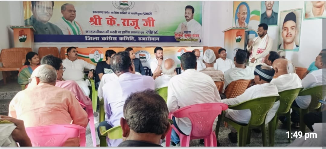 हजारीबाग : जिला कांग्रेस कार्यालय कृष्ण वल्लभ आश्रम में जिला कांग्रेस कार्यकारिणी की एक बैठक आहुत की गई। बैठक की अध्यक्षता जिला अध्यक्ष शैलेन्द्र कुमार यादव ने की। बैठक को संबोधित करते हुए जिला अध्यक्ष शैलेन्द्र कुमार यादव ने कहा की आगामी दिनांक: 24/05/2025 को जिला में होने वाली संविधान बचाओ रैली जिसका कार्यक्रम स्थल जिला कांग्रेस मैदान निर्धारित किया गया और इस जिला रैली के बाद होने वाले हजारीबाग जिला अंतर्गत आने वाले विधान सभा वाइज रैली पर विचार विमर्श किया गया। उन्होंने जातिय जनगणना और सरना धर्म कोड लागू कराने के लिए हर संभव प्रयास कर रहे लोकसभा प्रतिपक्ष के नेता राहुल गांधी की सराहना की। बैठक में उपस्थित कार्यकर्ताओं ने एक स्वर में संविधान बचाओ रैली कार्यक्रम को सफल बनाने का आह्वान किया। अध्यक्ष ने कहा कि इस कार्यक्रम कांग्रेस के मंत्रीगण विधायकगण तथा प्रदेश के पदाधिकारीगण शामिल होगे। इस अवसर पर सदर विधानसभा के प्रत्याशी रहे मुन्ना सिंह ने कहा की इस कार्यक्रम को सफल करने के लिए पार्टी की जो भी जिम्मेदारी मुझे दी जाएगी उस पर मैं पूरी तरह से खरा उतरूंगा। इस अवसर पर कई अन्य वक्ताओं ने भी अपने विचार को रखा। बैठक का संचालन जिला उपाध्यक्ष सह प्रवक्ता निसार खान जबकी धन्यवाद ज्ञापन महानगर अध्यक्ष मनोज नारायण भगत ने किया। बैठक में मुख्य रूप से प्रदेश सचिव शशि मोहन सिंह, बिनोद सिंह वरिष्ठ कांग्रेसी राजू चौरसिया, संजय तिवारी, अजय गुप्ता, सुनिल सिंह राठौर, कैलाश पति देव, सेवादल अध्यक्ष गुड्डु सिंह ओबीसी प्रदेश सचिव रेणु कुमारी, मिथिलेश दुबे, उपाध्यक्ष कृष्ण कुमार यादव, डाॅ.प्रकाश कुमार, सरयु यादव, ललितेश्वर प्रसाद चौधरी, कृष्णदेव प्रसाद सिंह, मकसूद आलम महासचिव दिलीप कुमार रवि, विजय कुमार सिंह, राजीव कुमार मेहता, सदरूल होदा, रघु जायसवाल, रंजीत यादव प्रखंड अध्यक्ष मो. नौशाद, अजित कुमार सिंह, रविन्द्र गुप्ता, नरसिंह प्रजापति, अब्बास अंसारी, अब्दुल मनान वारसी, गौतम कुमार मेहता, इकबाल रजा, परवेज अहमद सचिव राशिद खान, अनिल कुमार भुईंया मंडल अध्यक्ष जितेन्द्र गिरी, विष्णुधारी महतो, मुगेश्वर प्रसाद चौधरी अधिवक्ता इजहार अंसारी के अतिरिक्त कई कांग्रेसी उपस्थित थे।