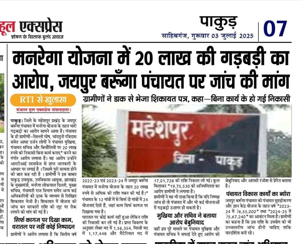 महेशपुर प्रखंड अंतर्गत जयपुर वरूगा पंचायत में मनरेगा योजना के तहत लाखों की गड़बड़ी का मामला सामने आने के बाद प्रशासन हरकत में आ गया है। “प्रभात खबर” द्वारा 3 जुलाई को “मनरेगा योजना में 20 लाख की गड़बड़ी का आरोप, जांच की मांग” शीर्षक से प्रकाशित खबर के बाद उपायुक्त मनीष कुमार ने मामले को गंभीरता से लेते हुए उच्च स्तरीय जांच टीम का गठन किया।