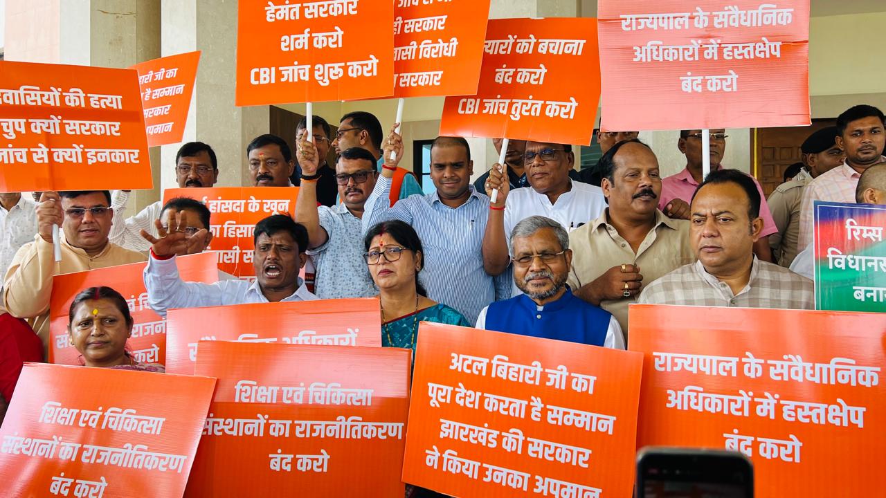रांची:झारखंड विधानसभा के मानसून सत्र का तीसरा दिन भी विपक्ष के जोरदार हंगामे की भेंट चढ़ गया। भाजपा और आजसू के विधायकों ने बांग्लादेशी घुसपैठ के मुद्दे को लेकर सदन के बाहर और अंदर जमकर विरोध प्रदर्शन किया।