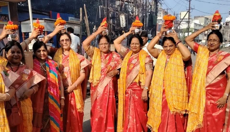 रांची : अखिल भारतीय मारवाड़ी महिला सम्मेलन रांची शाखा के द्वारा अग्रसेन पथ स्थित अग्रसेन भवन में श्रीमद् भागवत ज्ञान सप्ताह यज्ञ का रविवार को शुभारंभ हुआ । इस मौके पर लक्ष्मी नारायण मंदिर के प्रांगण से निकली कलश यात्रा अग्रसेन भवन में आकर संपन्न हुई। शोभा यात्रा में महिलाऐं पारंपरिक वेशभूषा में सिर में कलश धारण कर शामिल हुई और पुरुष पारंपरिक वेशभूषा में शामिल हुए।कलश यात्रा लक्ष्मी नारायण मंदिर से कथा स्थल पहुंची जहां पर व्यास पीठ पर श्रीमद् भागवत को विराजमान करके यजमानों के द्वारा पूजन किया गया। आज कथा के प्रथम दिवस में प्रारम्भ नासिक से पधारी सुप्रसिद्ध कथा वाचक गुरु मां चैतन्य मीरा के द्वारा श्रीमद् भागवत कथा श्रवण करने का और श्रीमद् भागवत कथा को जीवन में उतारने के महत्व को विस्तार से बताया ।
