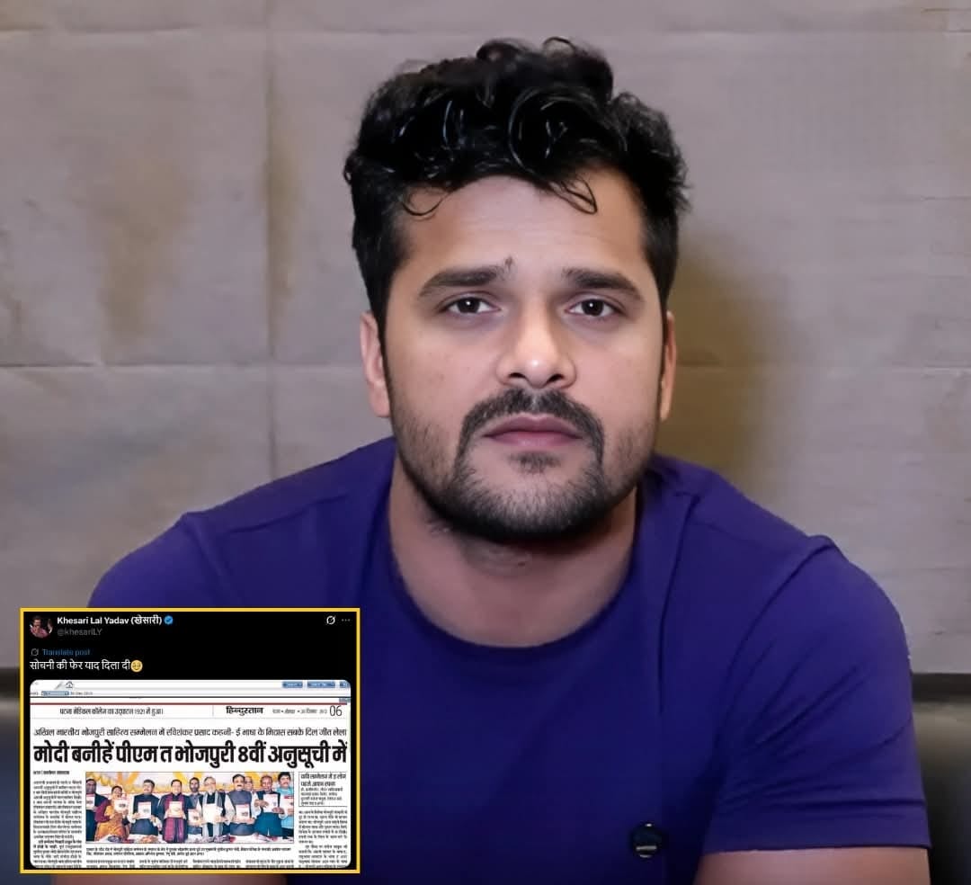 खेसारी ने एक्स (पहले ट्विटर) पर वर्ष 2013 की एक अखबार की कटिंग साझा की, जिसमें लिखा था— “मोदी बनेंगे पीएम तो भोजपुरी 8वीं अनुसूची में।” इस कटिंग को पोस्ट करते हुए खेसारी ने कैप्शन लिखा— “सोचनी की फेर याद दिला दी” (सोचा कि फिर से याद दिला दूं)।