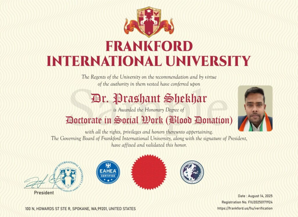साहिबगंज। साहिबगंज शहर के युवा समाजसेवी और उमामृता फाउंडेशन के संस्थापक प्रशांत शेखर ने जिले का नाम रोशन कर दिया है। सामाजिक सेवा और विशेषकर रक्तदान के क्षेत्र में उनके उल्लेखनीय योगदान के लिए अमेरिका की फ्रैंकफोर्ड इंटरनेशनल यूनिवर्सिटी ने उन्हें ऑनरेरी डॉक्टरेट की मानद उपाधि से सम्मानित किया है।
