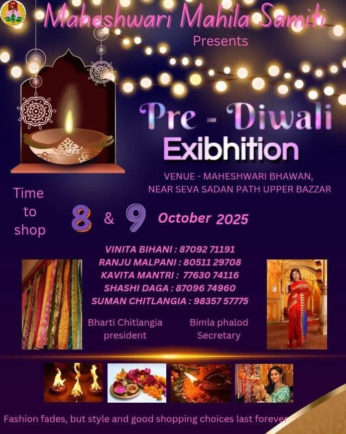 रांची : माहेश्वरी महिला समिति द्वारा प्री दिवाली एग्जीबिशन का आयोजन आगामी 8 एवं 9 अक्टूबर 2025 सेवा सदन पथ पर स्थित माहेश्वरी भवन में किया जा रहा है | इस एग्जीबिशन में ग्राहकों को मिलेगा एक ही छत के नीचे इस दिवाली घर सजावट के विभिन्न प्रकार के सामान जैसे कैंडल्स, दीया, बंदरवार, बेडशीट, डेकोरेटिव आइटम्स, गिफ्ट आइटम्स, त्यौहार में पहनने के लिए डिजाइनर साड़ी, कुर्ती, लहंगा, जेवलरी, भगवान जी के पोशाक एवं उनकी सजावट के सामान के साथ और भी अन्य सामान | प्री दिवाली एग्जीबिशन के लिए स्टॉल्स की बुकिंग शुरू हो चुकी है जिसके लिए निर्धारित शुल्क रखा गया है, कई स्टॉल बुक हो गये है | ग्राहकों के लिए खरीदारी के साथ फ़ूड स्टाल की भी व्यवस्था है | एग्जिभीशन स्टाल बुकिंग के लिए अध्यक्ष भारती चितलांगिया ( 97080 36702 ) , एग्जीबिशन सयोजक विनीता बियानी ( 87092 71191 ) कविता मंत्री ( 77630 74116 ), रंजू मालपानी ( 80511 29708 ) , शशि डागा ( 87096 74960 ) , सुमन चितलांगिया ( 98357 57775 ) से संपर्क करें |