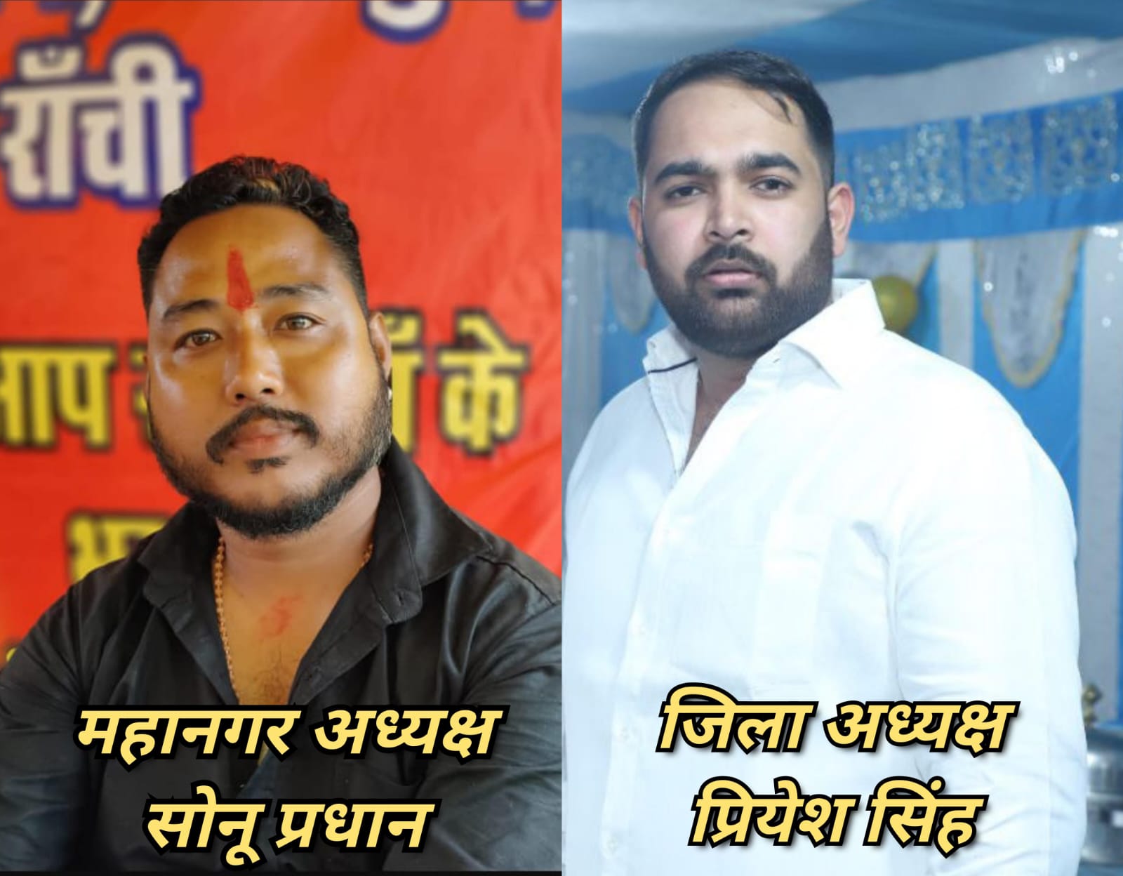राची: मां काली सेना की नई कमेटी का गठन करते हुए संगठन ने महानगर और जिला स्तर पर नई जिम्मेदारियाँ सौंपी हैं। सोनू प्रधान को महानगर अध्यक्ष जबकि प्रियेश सिंह को जिला अध्यक्ष बनाया गया है।