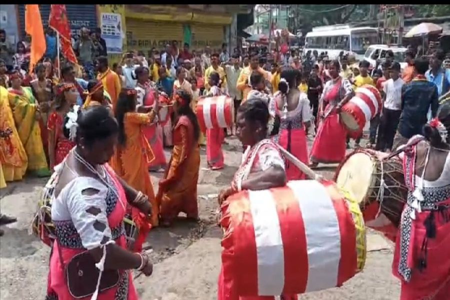 पाकुड़। जिले के हिरणपुर डाकबंगला परिसर से सोमवार को भव्य कलश यात्रा निकाली गई। यात्रा के दौरान पूरा क्षेत्र भक्तिमय माहौल में सराबोर हो उठा। इस बार की कलश यात्रा विशेष रही, क्योंकि पहली बार महिला ढाकियों ने ढाक की गूंज से वातावरण को जीवंत बना दिया। पश्चिम बंगाल से आईं महिला ढाकियों की प्रस्तुति को श्रद्धालुओं ने खूब सराहा।