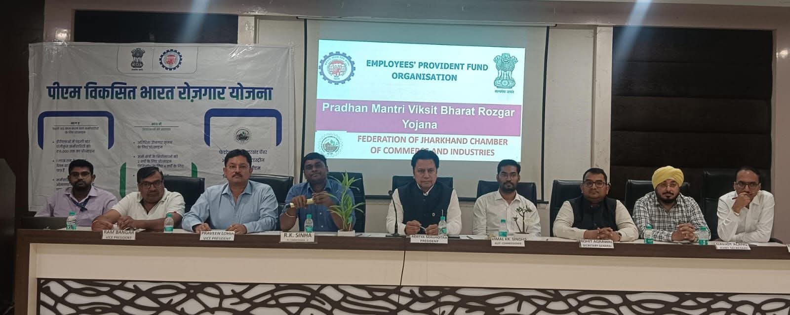 रांची : फेडरेशन ऑफ झारखण्ड चैम्बर ऑफ कॉमर्स एंड इंडस्ट्रीज के सहयोग से कर्मचारी भविष्य निधि संगठन के क्षेत्रीय कार्यालय, रांची द्वारा प्रधानमंत्री विकसित भारत रोजगार योजना के अंतर्गत जागरूकता कार्यक्रम का आयोजन आज चैम्बर भवन में किया गया। कार्यक्रम में ईपीएफओ के रीजनल कमिश्नर राकेश कुमार सिन्हा ने योजना की विस्तृत जानकारी साझा की। उन्होंने बताया कि प्रधानमंत्री विकसित भारत रोजगार योजना का उद्देश्य रोजगार सृजन को प्रोत्साहन देना तथा नए कर्मचारियों को औपचारिक क्षेत्र में लाना है। इस योजना के तहत योग्य प्रतिष्ठानों को नए कर्मचारियों की भर्ती पर सरकार द्वारा ईपीएफ योगदान में सब्सिडी दी जाएगी। सरकार नियोक्ता और कर्मचारी दोनों को इस योजना के अंतर्गत वित्तीय लाभ प्रदान करती है जिससे उद्योगों पर वित्तीय भार कम होता है। श्री सिन्हा ने बताया कि यह योजना 1 अगस्त 2025 से प्रारंभ होकर 31 जुलाई 2027 तक लागू रहेगी। मैन्युफैक्चरिंग सेक्टर में यह योजना अगले दो वर्ष और लागू रहेगी। उन्होंने यह भी जानकारी दी कि अन्य देशों में ऐसी योजनाओं का लाभ 10-15 फीसदी अतिरिक्त रोजगार सृजित हुए हैं। इसलिए देश में इस योजना से साढ़े तीन करोड़ अतिरिक्त रोजगार सृजन का लक्ष्य निर्धारित किया गया है।