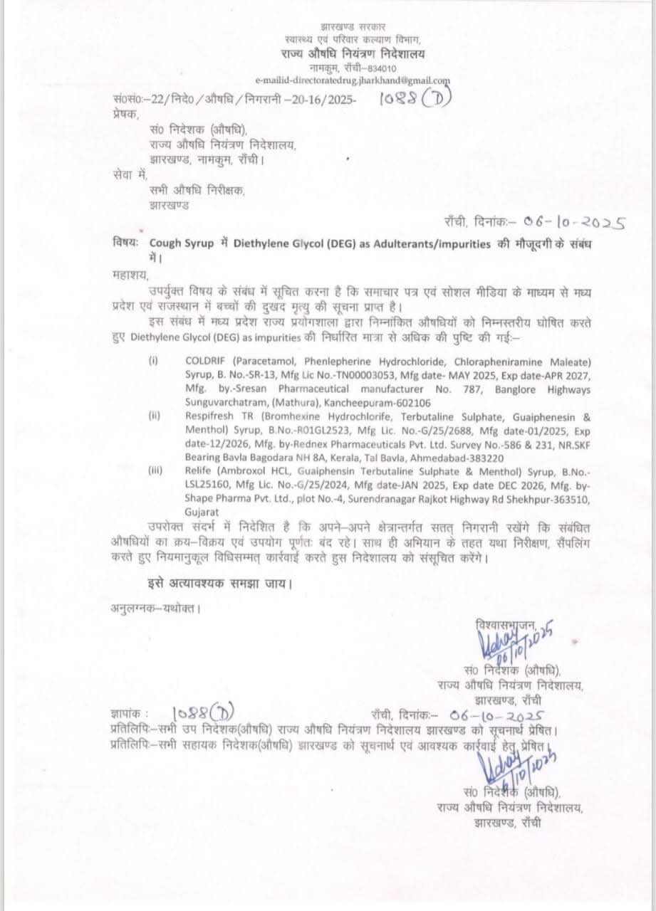 यह निर्देश निदेशालय की ओर से संचालक (औषधि), राज्य औषधि नियंत्रण निदेशालय, रांची द्वारा जारी किया गया है, जिसमें बताया गया है कि कुछ कफ सिरपों में DEG जैसे हानिकारक तत्व पाए जाने की सूचना विभिन्न राज्यों और मीडिया माध्यमों से प्राप्त हुई है।