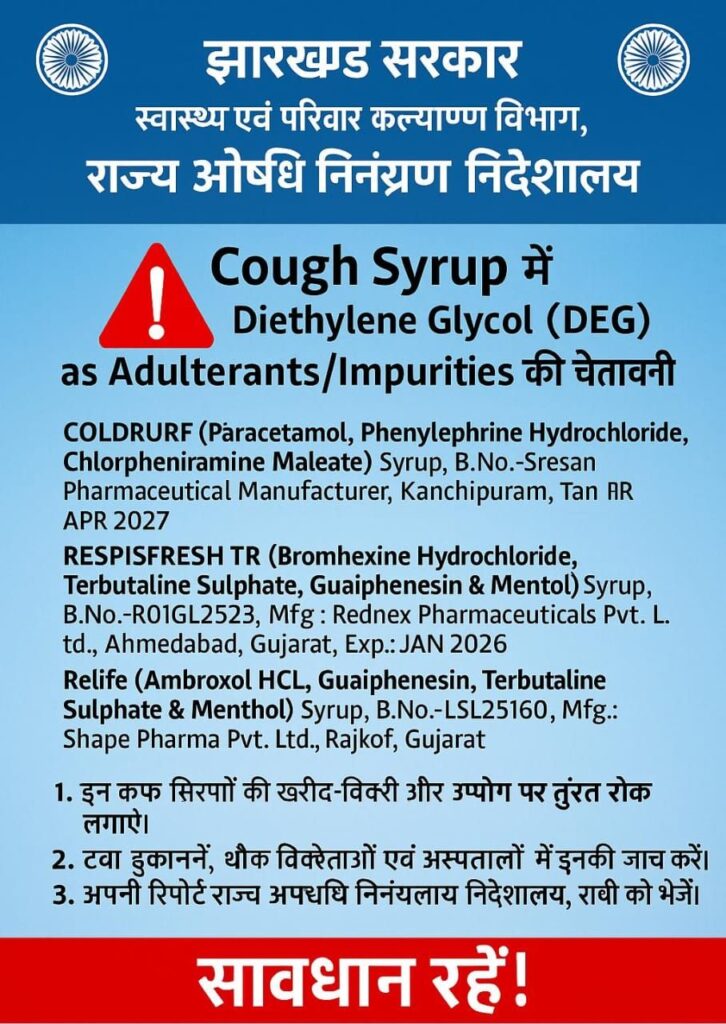 झारखंड सरकार के स्वास्थ्य एवं परिवार कल्याण विभाग के अधीन राज्य औषधि नियंत्रण निदेशालय ने राज्य भर में Diethylene Glycol (DEG) युक्त संदिग्ध कफ सिरप (Cough Syrup) की बिक्री और उपयोग को लेकर सतर्कता बरतने का निर्देश जारी किया है।