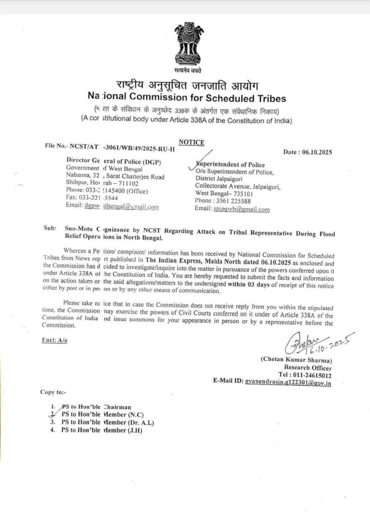 आयोग द्वारा जारी नोटिस में पश्चिम बंगाल पुलिस महानिदेशक (DGP) और जलपाईगुड़ी जिला पुलिस अधीक्षक (SP) से कहा गया है कि वे इस मामले में की गई कार्रवाई और तथ्यों की जानकारी आयोग को तत्काल उपलब्ध कराएं।