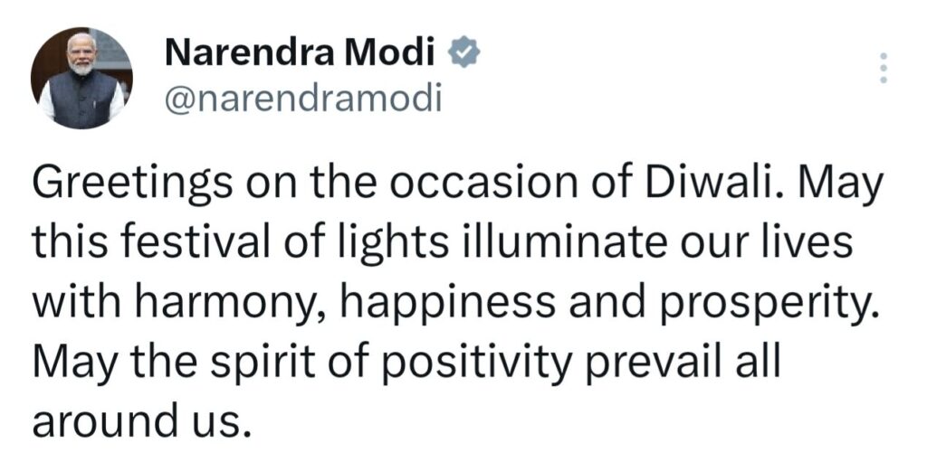 प्रधानमंत्री के इस संदेश के साथ भगवान राम की मूर्ति को दीपों से सजाए हुए एक छवि भी साझा की गई, जो दीपावली के आध्यात्मिक महत्व को दर्शाती है। यह पोस्ट कुछ ही घंटों में हजारों लाइक्स और सैकड़ों रीपोस्ट प्राप्त कर चुकी है।इस संदेश ने सोशल मीडिया पर व्यापक प्रतिक्रिया उत्पन्न की है, जहाँ देश-विदेश से लोग अपनी क्षेत्रीय भाषाओं में शुभकामनाएं दे रहे हैं और सांस्कृतिक एकता का संदेश फैला रहे हैं। प्रधानमंत्री का यह संदेश दीपावली के पांच दिवसीय उत्सव के दौरान आया है, जो धनतेरस से शुरू होकर भाई दूज तक चलता है।