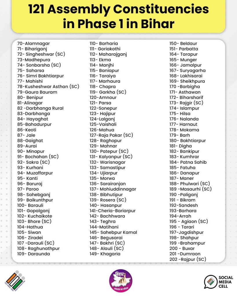निर्वाचन आयोग नेस्वतंत्र और निष्पक्ष चुनाव कराने के लिए व्यापक इंतजाम किए हैं। आयोग ने मतदाताओं से बढ़-चढ़कर मतदान में भाग लेने की अपील की है। चुनाव आयोग ने ट्वीट कर कहा, “बिहार में #Phase1 चुनाव आज से शुरू! 121 विधानसभा क्षेत्रों में 6 नवंबर 2025 को मतदान होगा।”