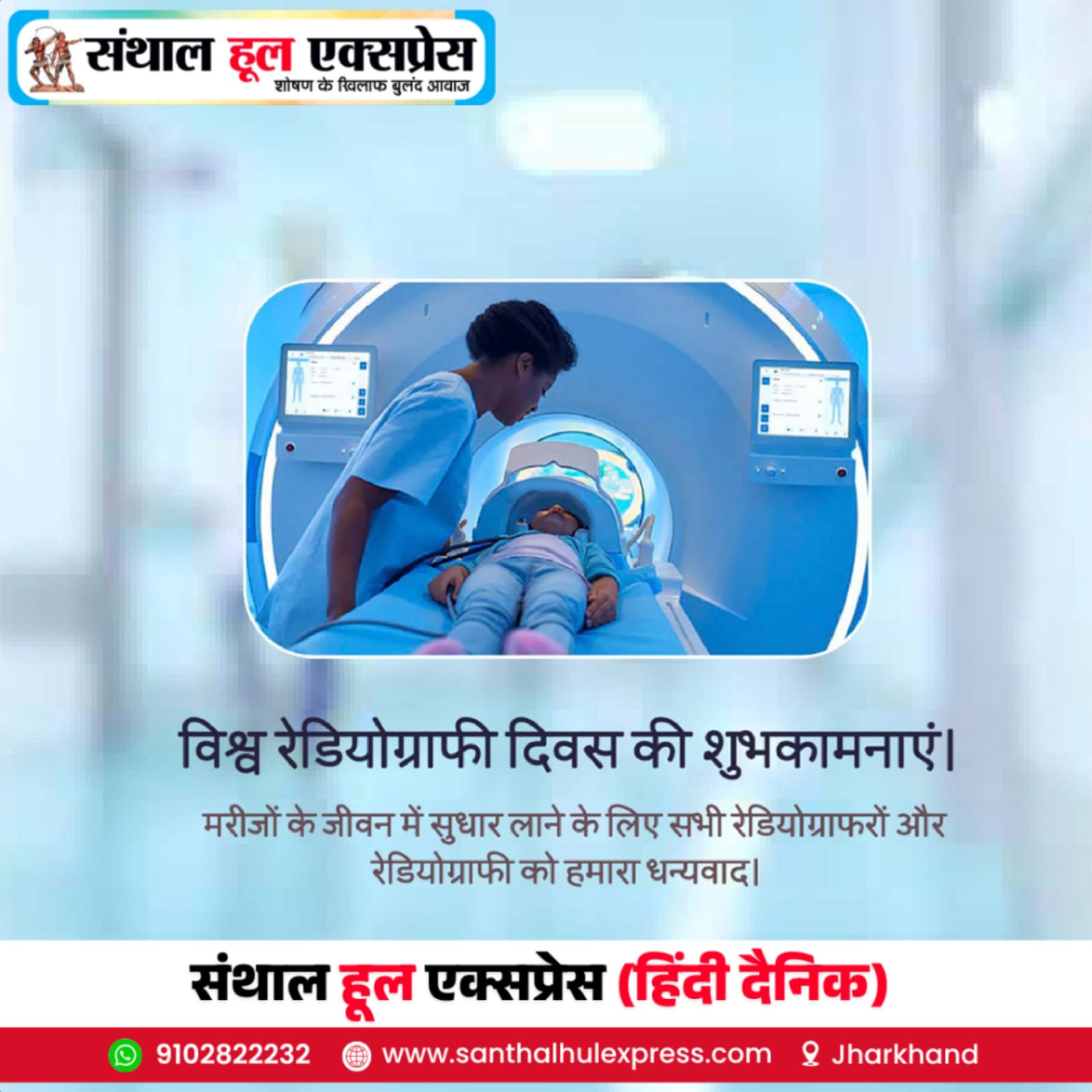 विश्व रेडियोग्राफी दिवस पर संथाल हूल एक्सप्रेस (हिंदी दैनिक) ने सभी रेडियोग्राफरों एवं मेडिकल इमेजिंग विशेषज्ञों को धन्यवाद दिया है, जो प्रतिदिन मरीजों के जीवन को सुरक्षित और बेहतर बनाने का कार्य कर रहे हैं।
