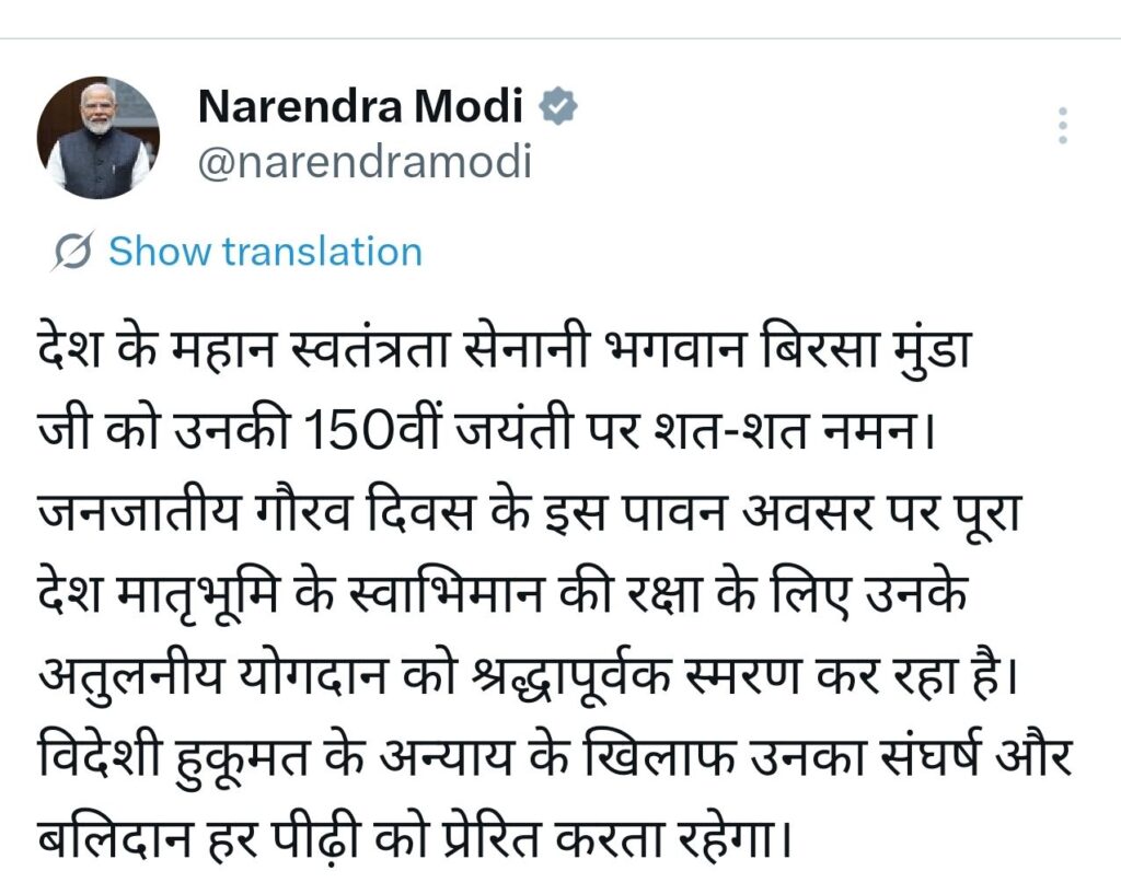 नई दिल्ली, 15 नवंबर 2025। आज जनजातीय गौरव दिवस के पावन अवसर पर प्रधानमंत्री नरेंद्र मोदी ने देश के महान स्वतंत्रता सेनानी भगवान बिरसा मुंडा को उनकी 150वीं जयंती पर शत-शत नमन किया। सोशल मीडिया प्लेटफॉर्म एक्स पर पोस्ट किए गए संदेश में पीएम मोदी ने बिरसा मुंडा के अतुलनीय योगदान को याद करते हुए कहा कि उनके संघर्ष और बलिदान ने हर पीढ़ी को प्रेरित किया है।