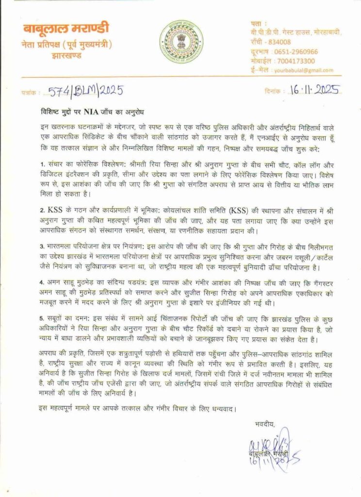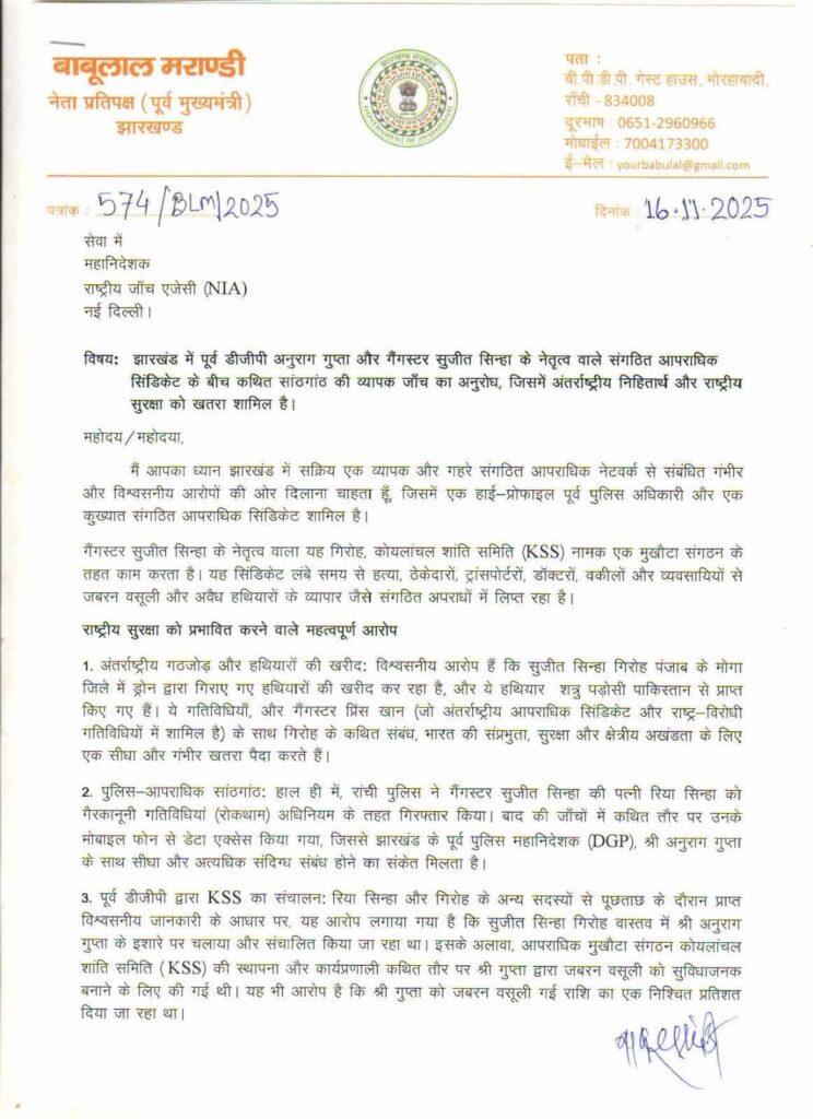 रांची। झारखंड में पूर्व डीजीपी अनुराग गुप्ता और कुख्यात गैंगस्टर सुजीत सिन्हा के कथित आपराधिक गठजोड़ के मामले ने एक बार फिर राजनीतिक और सुरक्षा एजेंसियों का ध्यान खींचा है। नेता प्रतिपक्ष और पूर्व मुख्यमंत्री बाबूलाल मरांडी ने इस गंभीर मुद्दे पर राष्ट्रीय जांच एजेंसी (NIA) को विस्तृत जांच के लिए आधिकारिक पत्र भेजा है। मरांडी ने अपने पत्र में आरोप लगाया है कि यह गठजोड़ एक संगठित अंतर्राष्ट्रीय आपराधिक सिंडिकेट का हिस्सा है, जिसकी गतिविधियां राज्य की कानून-व्यवस्था, आंतरिक सुरक्षा और राष्ट्रीय हितों के लिए गंभीर खतरा हैं।