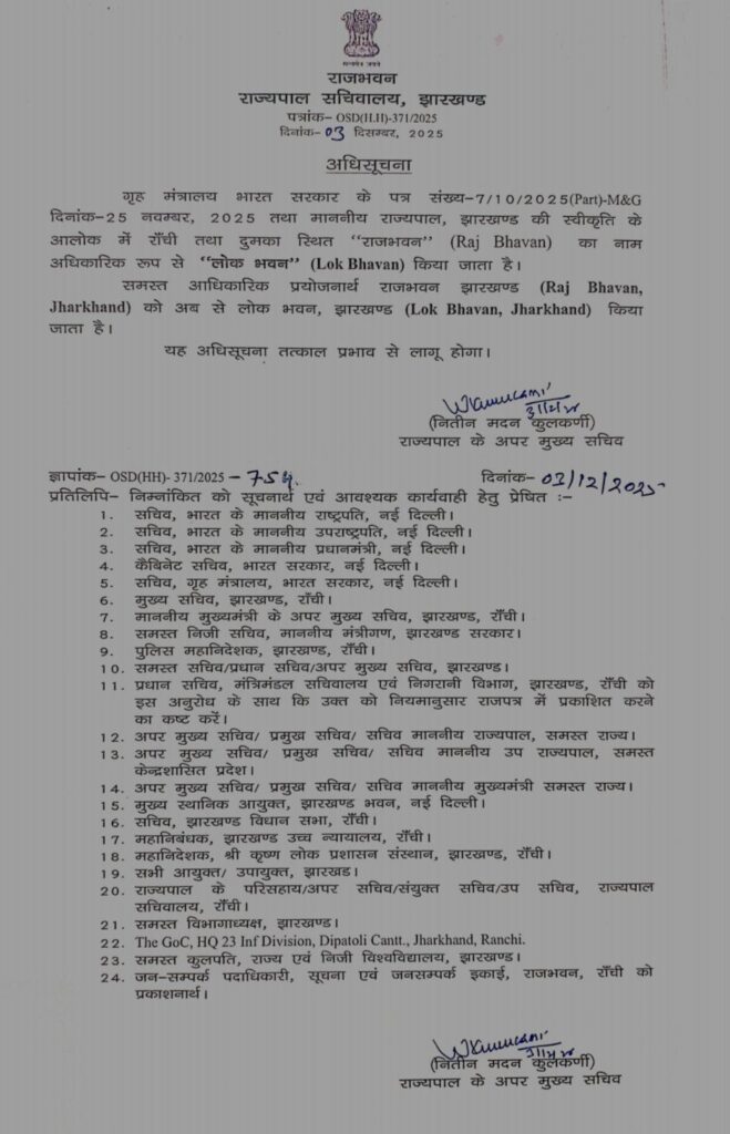 “माननीय प्रधानमंत्री श्री @narendramodi जी के दूरदर्शी मार्गदर्शन में गृह मंत्रालय की पहल के तहत देश के सभी राजभवन अब ‘लोक भवन’ की लोक-केंद्रित पहचान प्राप्त कर रहे हैं। इसी क्रम में अब से राजभवन झारखण्ड ‘लोक भवन झारखण्ड’ के नाम से जाना जाएगा।”