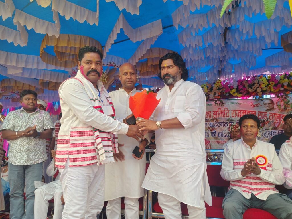 राजमहल | प्रखंड के कल्याणचक रेलवे मैदान में शनिवार को आदिवासी संघर्ष सरना समिति राजमहल एवं तालझारी द्वारा सरहुल पर्व धूमधाम से मनाया गया। कार्यक्रम में मुख्य अतिथि के रूप में राजमहल सांसद विजय कुमार हांसदा तथा राजमहल विधायक मो. ताजुद्दीन उर्फ एमटी राजा उपस्थित हुए। आयोजन समिति की ओर से अतिथियों का स्वागत बुके, सखुआ के फूल, डाली तथा अंगवस्त्र भेंट कर किया गया।